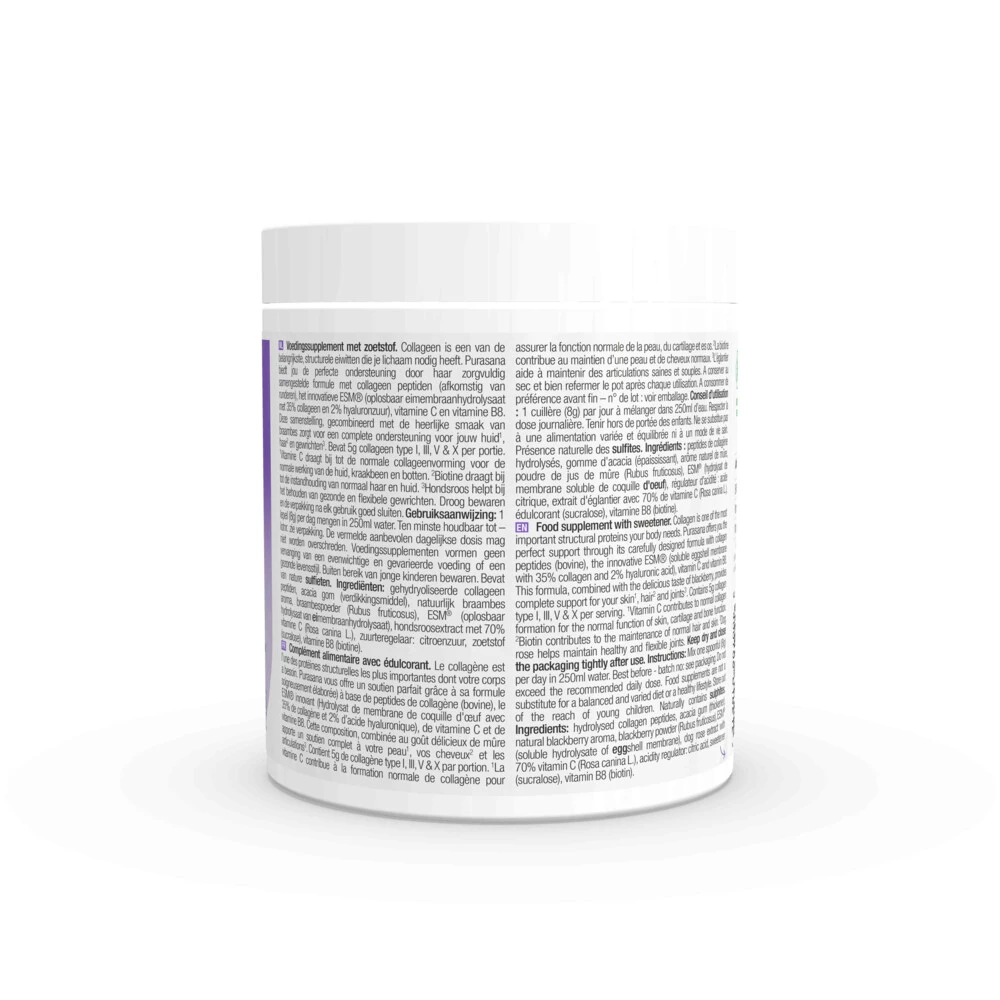Purasana Collageen Zwarte Bes Huid, Haar en NagelsPurasana Collageen Zwarte Bes Huid, Haar en Nagels is een voedingssupplement bestaande uit een zorgvuldig samengestelde formule met collageen peptiden afkomstig van runderen, ESM (oplosbaar eiermembraanhydrolysaat met 35% collageen en 2% hyalonzuur), vitamine C en vitamine B8. Deze bijzondere samenstelling biedt ondersteuning voor huid, haar en gewrichten*. Collageen is een van de meest essentiële, structuele eiwitten die het lichaam nodig h