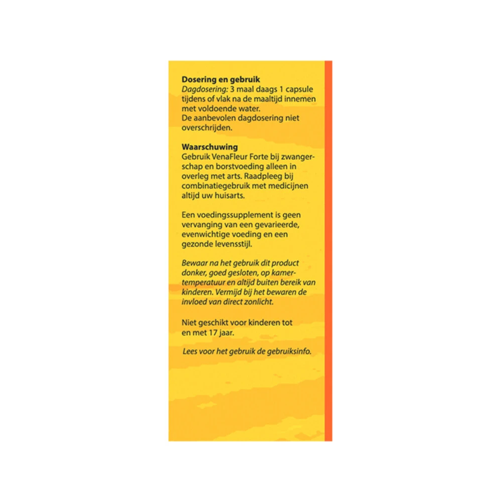 VenaFleur Benen Formule(1)Bloem VenaFleur is een voedingssupplement dat naast een gestandaardiseerd druivenpit extract, tevens vitamines, mineralen en kruiden bevat. Eén van de kruiden is Paardenkastanje*, dat helpt bij zware benen en is goed voor de bloedcirculatie. Vitamine C* is gunstig is voor soepele aderen en voor een goede conditie van de bloedvaten.Voor de bloedcirculatie (Paardenkastanje)*Bij zware benen (Paardenkastanje)*Voor een goede conditie van de bloedvaten (Vitamine