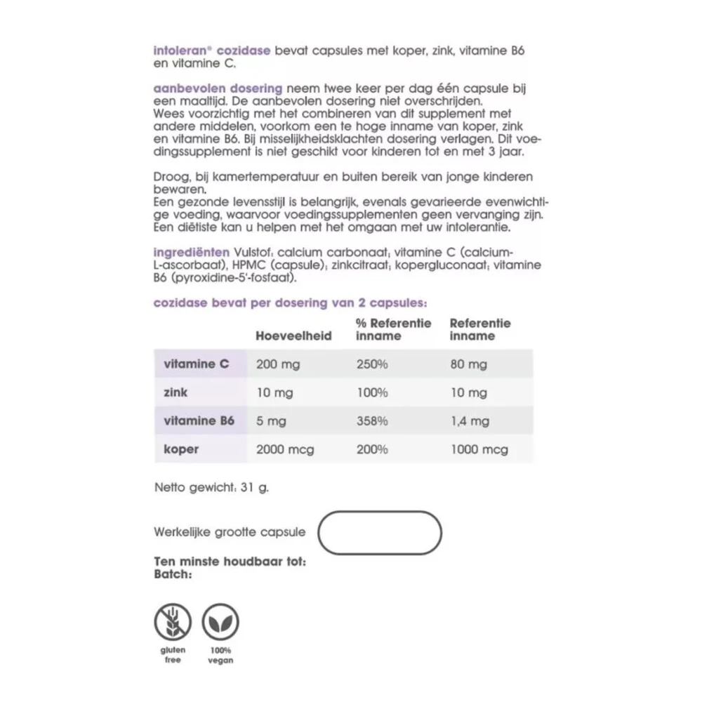 Intoleran CozidaseCozidase biedt een aanvulling van koper en zink, voor een goede werking van bepaalde enzymprocessen. Daarnaast bevat cozidase vitamine C en vitamine B6 voor een complete werking en brede ondersteuning.Bevat vitamine B6 en CBrvat de mineralen Koper en ZinkGlutevrij100% VeganGeschikt voor vegetariërsGeschikt voor kinderen vanaf 4 jaar