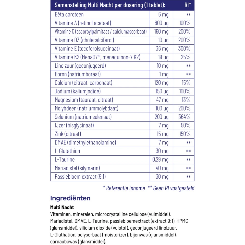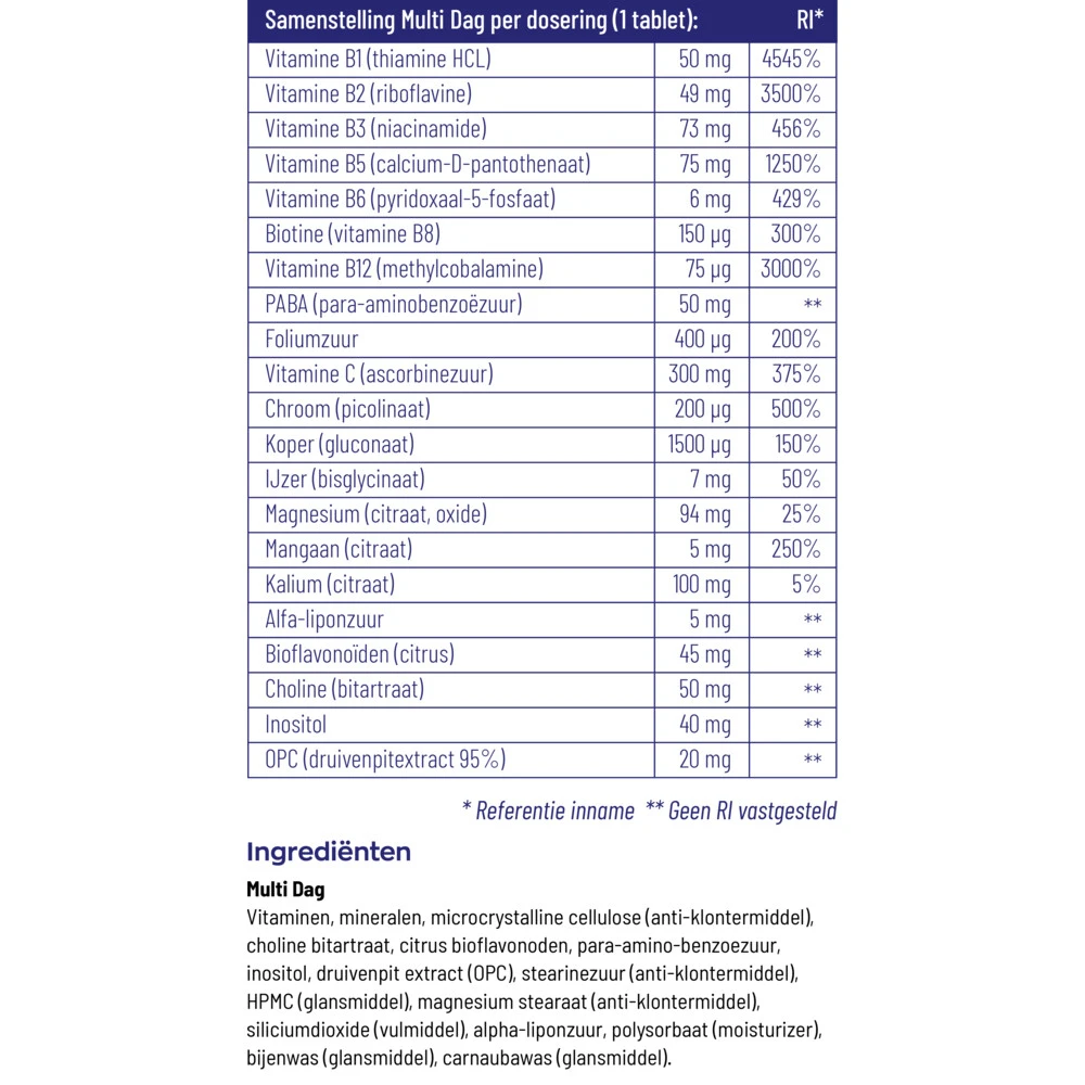 Vitakruid Multi Dag & Nacht 2 x 30 tablettenVitakruid Multi Dag & Nacht heeft een uitgekiende formule op basis van het bioritme. De multivitamine geeft het lichaam overdag voedingsstoffen voor de energie die je nodig hebt om fit, scherp en alert te zijn en ’s avonds voedingsstoffen die helpen om lekker te slapen en het lichaam te ondersteunen bij de opbouw van de hersen-, spier- en zenuwcellen. Zo activeert de hoge dosering vitamine B12 in de Multi Dag de natuurlijke energie in het